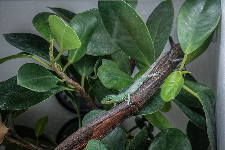 Aufmerksame Zoogäste im Zoologischen Garten der Stadt Wuppertal können in der Nachzuchtstation in drei kleinen Schaugehegen vor Kurzem geschlüpften Nachwuchs der Grünen Baumeidechse (Gastropholis prasina) entdecken.