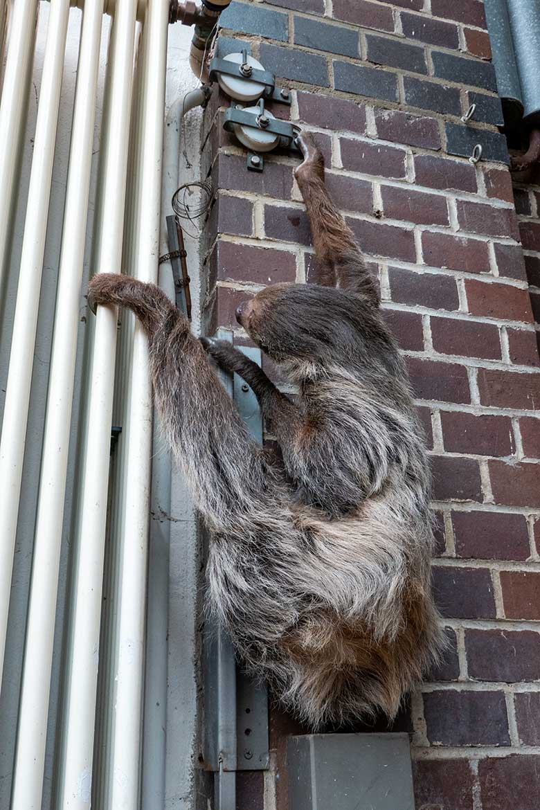 Am letzten Februar-Tag 2023 konnten Zoogäste im Südamerika-Haus im Zoologischen Garten der Stadt Wuppertal beobachten, wie das männliche Zweifingerfaultier "Clyde" einen warmen Platz über den hohen Heizrippen verschmähte und stattdessen zu dem flachen und zum Liegen wohl bequemeren Heizkörper unter der Decke kletterte.