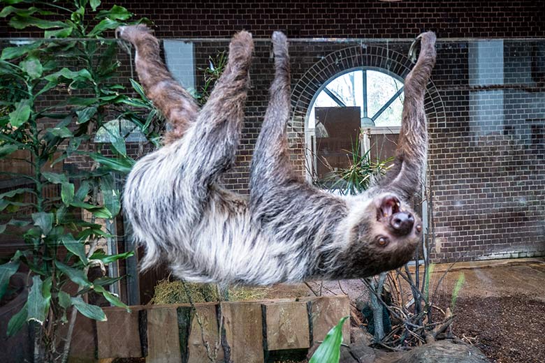 Männliches Zweifingerfaultier CLYDE am 28. Februar 2023 im Südamerika-Haus im Grünen Zoo Wuppertal.