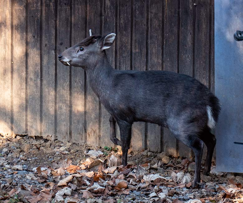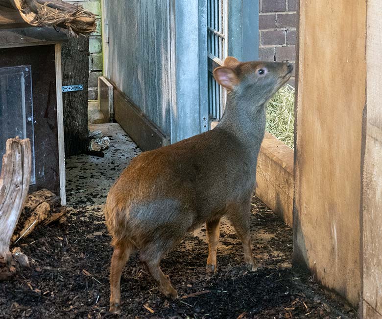 Weiblicher Ostchinesischer Schopfhirsch am 22. Februar 2023 auf der neuen Panda-Anlage im Wuppertaler Zoo.