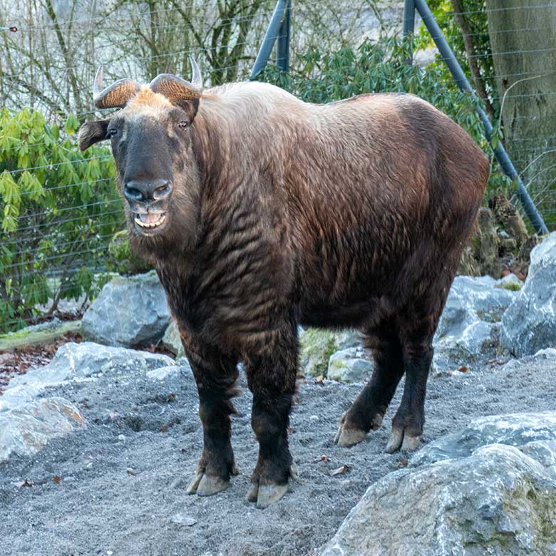 Mishmi-Takin-Kuh KARUNA am 7. Februar 2023 auf der oberen Außenanlage im Wuppertaler Zoo.