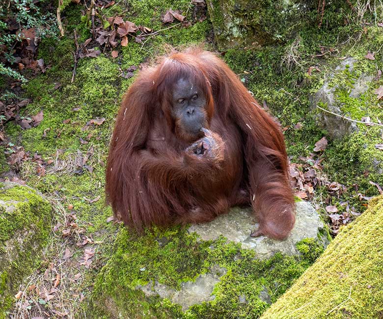 Weiblicher Orang-Utan JAKOWINA am 22. Februar 2023 auf der Außenanlage am Menschenaffen-Haus im Grünen Zoo Wuppertal.