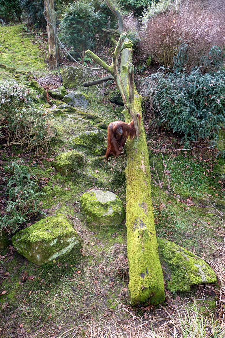 Der weibliche Orang-Utan "Jakowina" erkundet auch schon mal allein Bereiche der Außenanlage am Menschenaffen-Haus im Zoologischen Garten der Stadt Wuppertal.