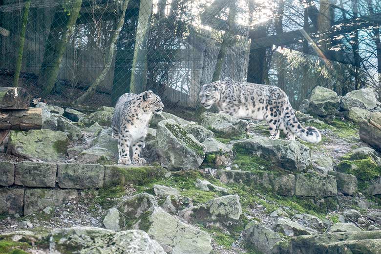 Schneeleoparden-Katze ADITI und Schneeleoparden-Kater IRBIS am 9. Februar 2023 auf der Außenanlage im Wuppertaler Zoo.