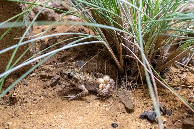 Eiertragende männliche Mallorca-Geburtshelferkröte am 6. Dezember 2023 in einem Schaugehege im Terrarium im Zoologischen Garten Wuppertal.