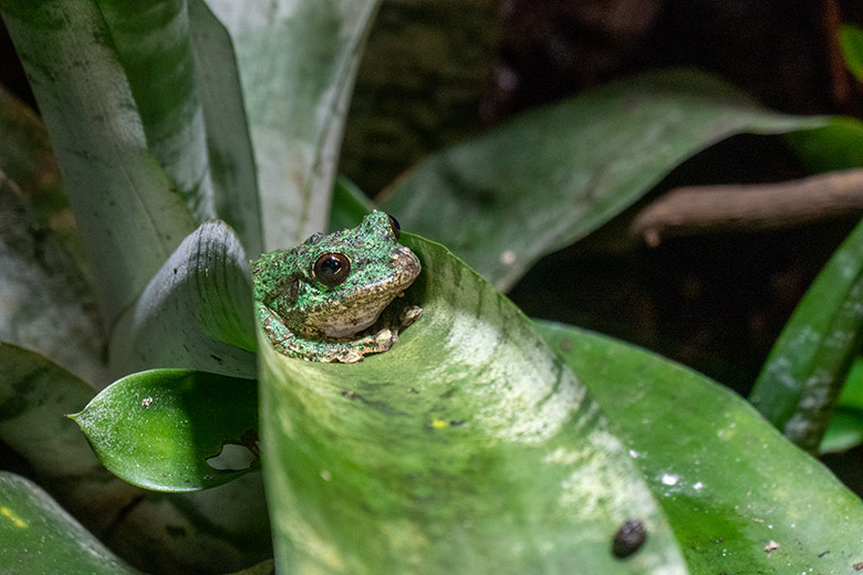 Einer der zehn San Martin Fransenlaubfrösche am 16. Februar 2024 in einem Schaugehege im Aquarium im Grünen Zoo Wuppertal.