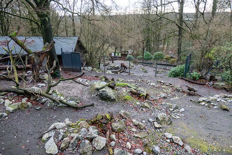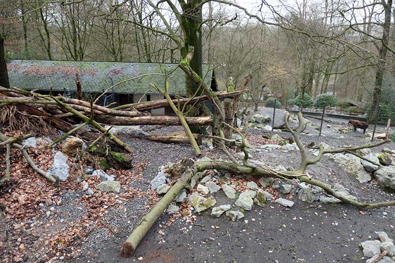 Der große Bereich der Takin-Außenanlage auf dem Areal der einstigen Anlage für Rentiere und Kiangs mit Innen-Stall im früheren Rentier-Haus.
