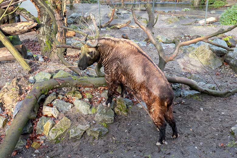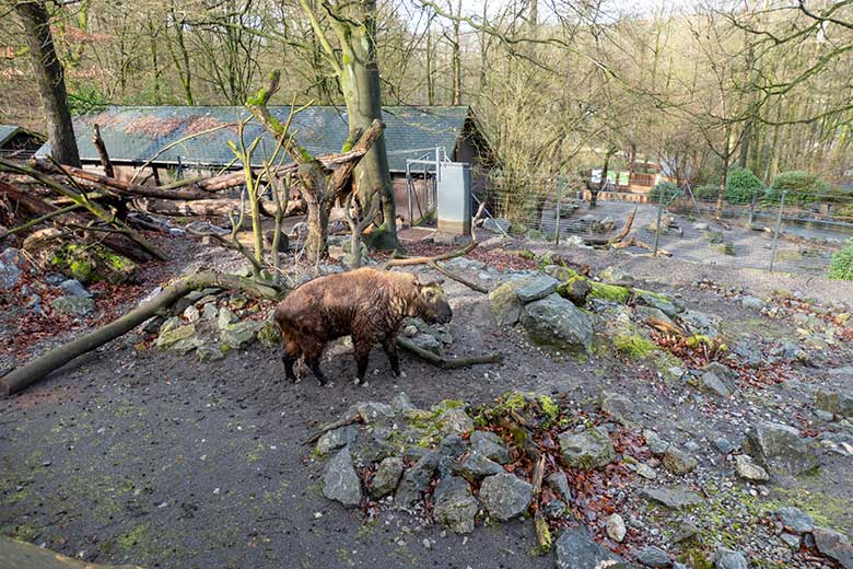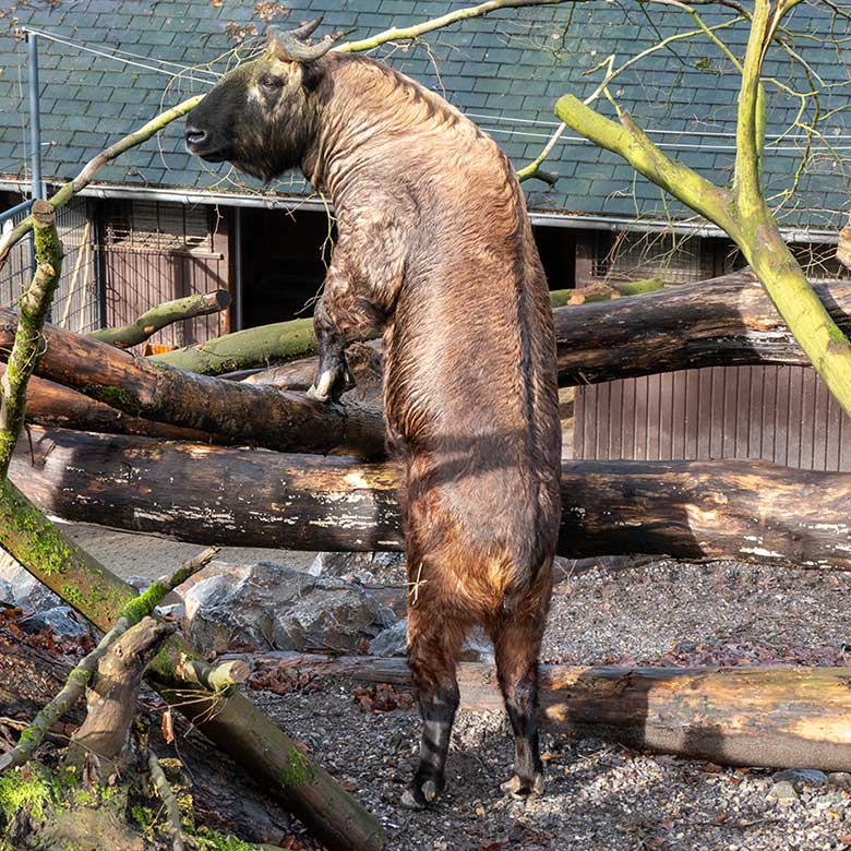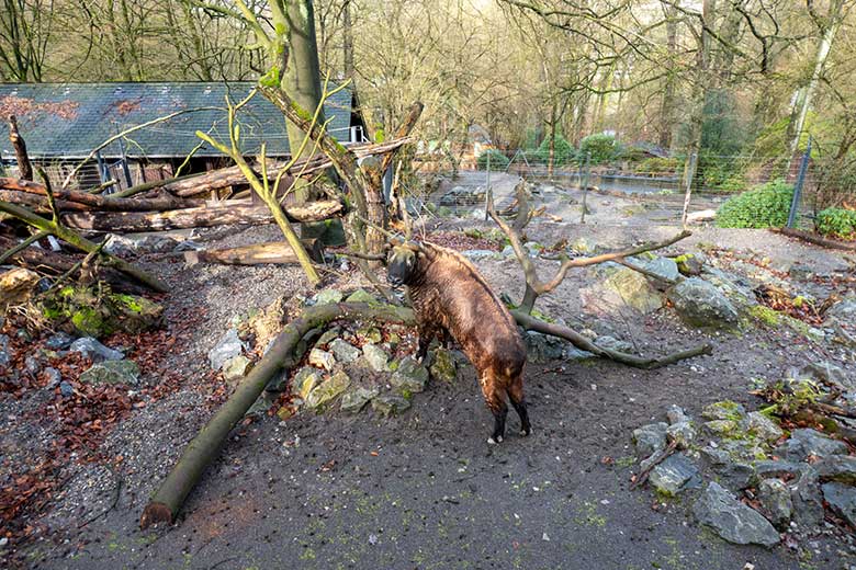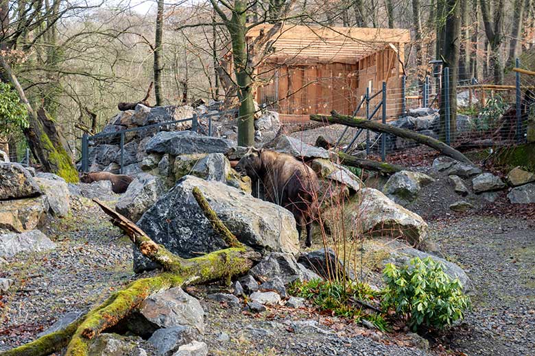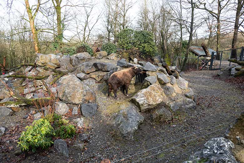 Mishmi-Takin-Kühe MINJA, TASHI und KARUNA am 19. Februar 2024 auf der Erweiterungs-Anlage im Zoologischen Garten Wuppertal.