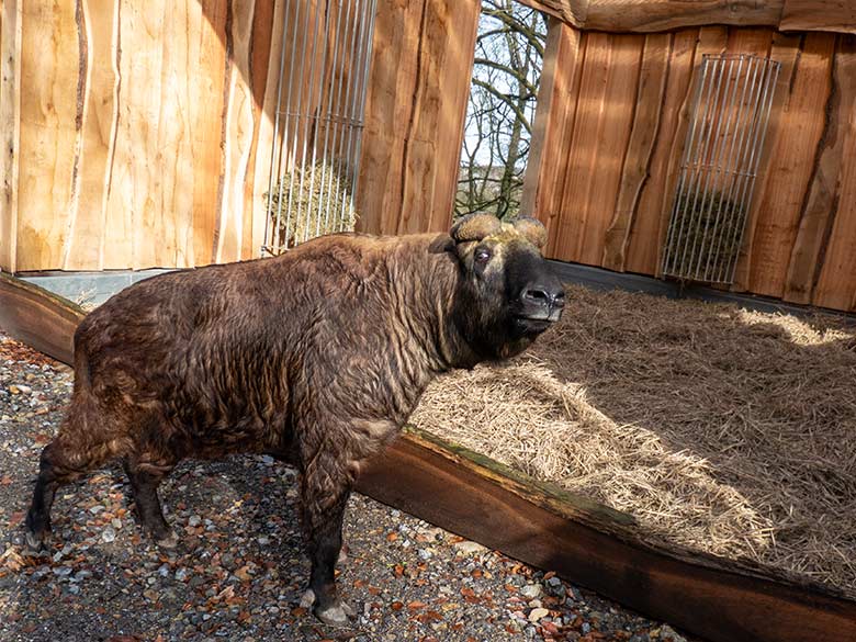 Mishmi-Takin-Kühe MINJA, TASHI und KARUNA am 19. Februar 2024 auf der Erweiterungs-Anlage im Grünen Zoo Wuppertal.