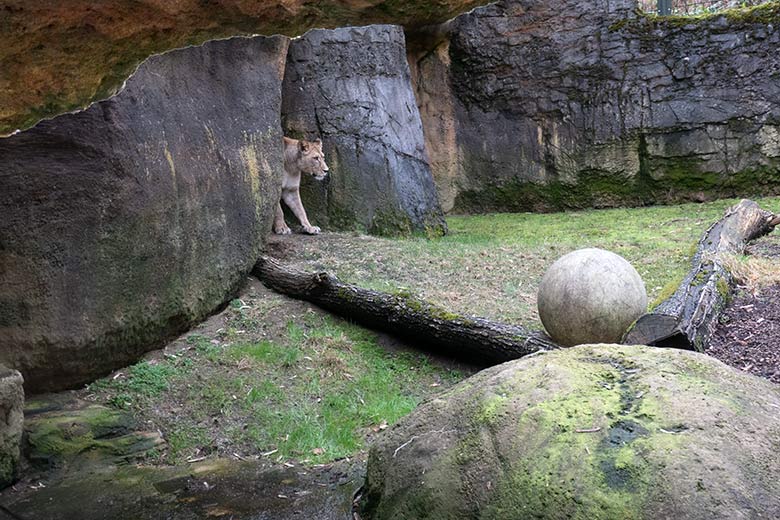 Berberlöwin ALORE am 18. Februar 2024 auf der kleinen Außenanlage am Löwen-Haus im Zoologischen Garten Wuppertal.