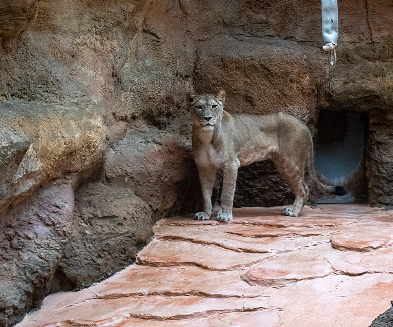Berberlöwin ALORE am 16. Februar 2024 im Innen-Schaugehege im Löwen-Haus im Zoo Wuppertal.
