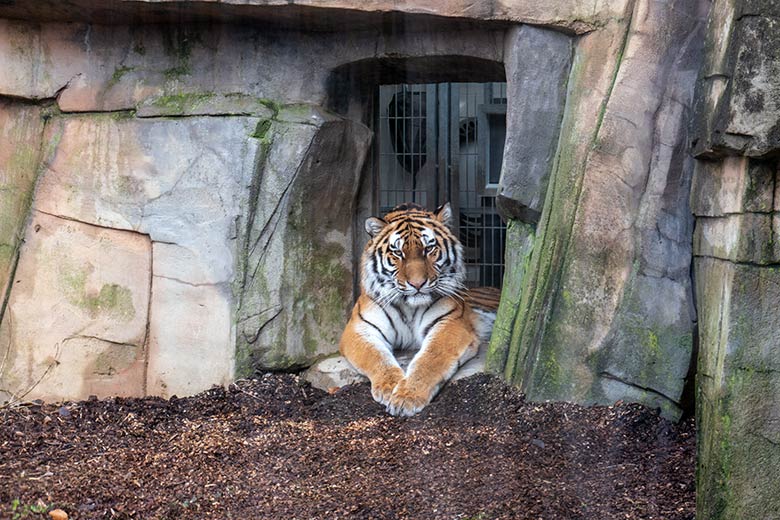 Amur-Tiger-Katze TULLIA am 15. Februar 2024 auf der kleinen Außenanlage im Tiger-Tal im Zoologischen Garten der Stadt Wuppertal.