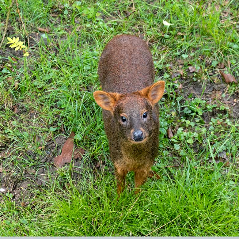 Weibliches Südpudu-Jungtier am 20. April 2024 auf der Pudu-Anlage am Überwinterungs-Haus im Zoo Wuppertal.