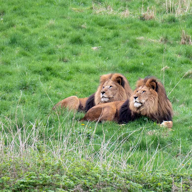 Afrikanische Löwen-Kater SHAWANO und TAMO am 7. April 2024 auf der Löwen-Savanne im Grünen Zoo Wuppertal.