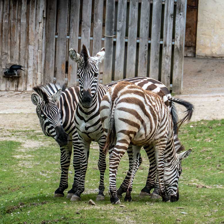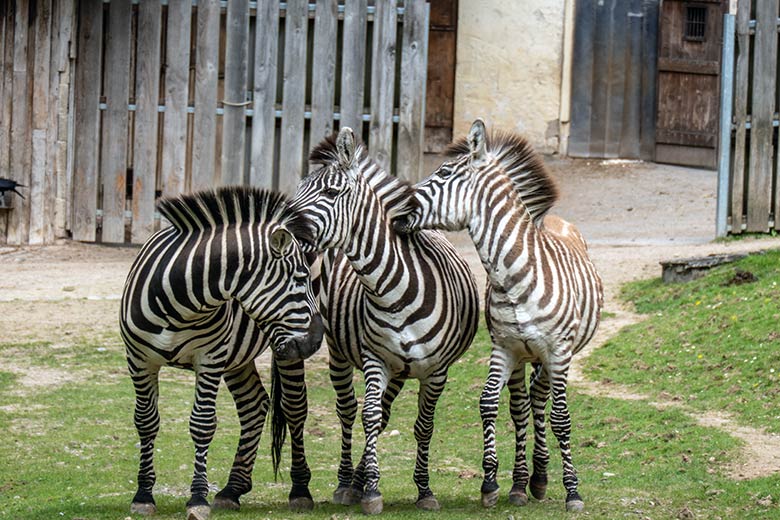 Drei Böhmzebras am 14. April 2024 auf der Afrika-Anlage im Grünen Zoo Wuppertal.