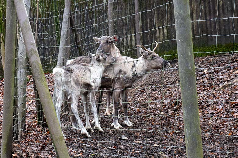 Weibliches Europäisches Waldrentier ORVOKKI, männliches Waldrentier-Jungtier, adultes männliches Europäisches Waldrentier und weibliches Europäisches Waldrentier LUNA (hinten) am 8. Januar 2025 auf dem Waldgelände der Außenanlage im Wuppertaler Zoo.