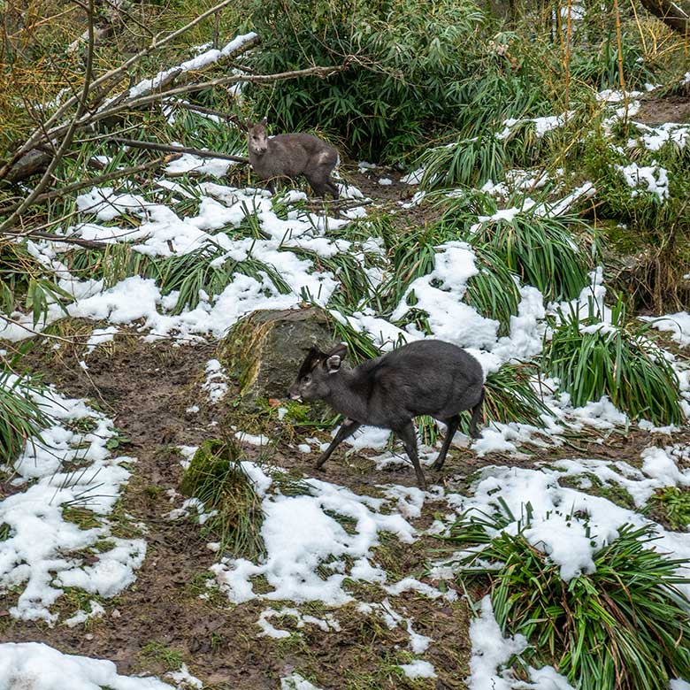 Männlicher Ostchinesischer Schopfhirsch JANNO und weiblicher Ostchinesischer Schopfhirsch FALBALA am 16. Januar 2025 auf der Panda-Außenanlage im Grünen Zoo Wuppertal.