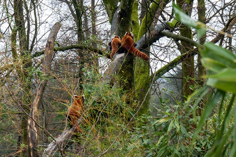 Weibliches Roter Panda-Jungtier JINJIN, adulter weiblicher Roter Panda UMA (rechts) und adulter männlicher Roter Panda LIAM (oben) am 24. Januar 2025 auf der Panda-Außenanlage im Grünen Zoo Wuppertal.