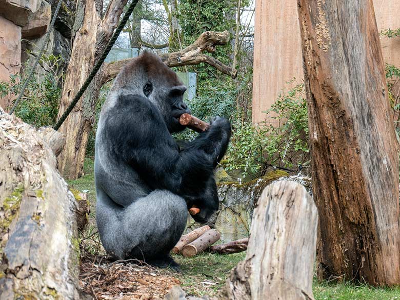 Männlicher Westlicher Flachlandgorilla VIMOTO am 20. Februar 2025 auf der Außenanlage am Menschenaffen-Haus im Grünen Zoo Wuppertal.