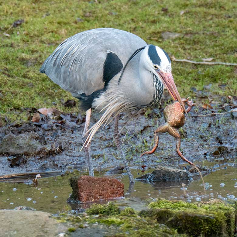 Graureiher mit Froschlurch am 26. Februar 2025 am Wasser der Patagonien-Anlage im Grünen Zoo Wuppertal.