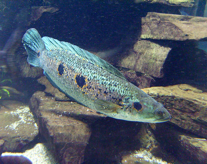 Gefleckter Schlangenkopffisch (Channa pleurophthalma) im Wuppertaler Zoo im April 2008.