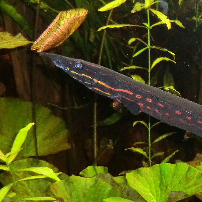 Rotstreifen-Stachelaal (Mastacembelus erythrotaenia) im Wuppertaler Zoo im Mai 2014.