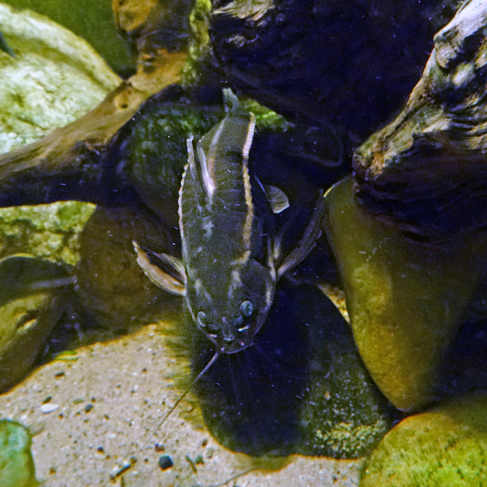 Der Dornwels lebt im Aquarium gemeinsam in einem Becken mit einem Wabenschilderwels (Pterygoplichthys gibbiceps) und den Piranhas (Serrasalmus nattereri).
