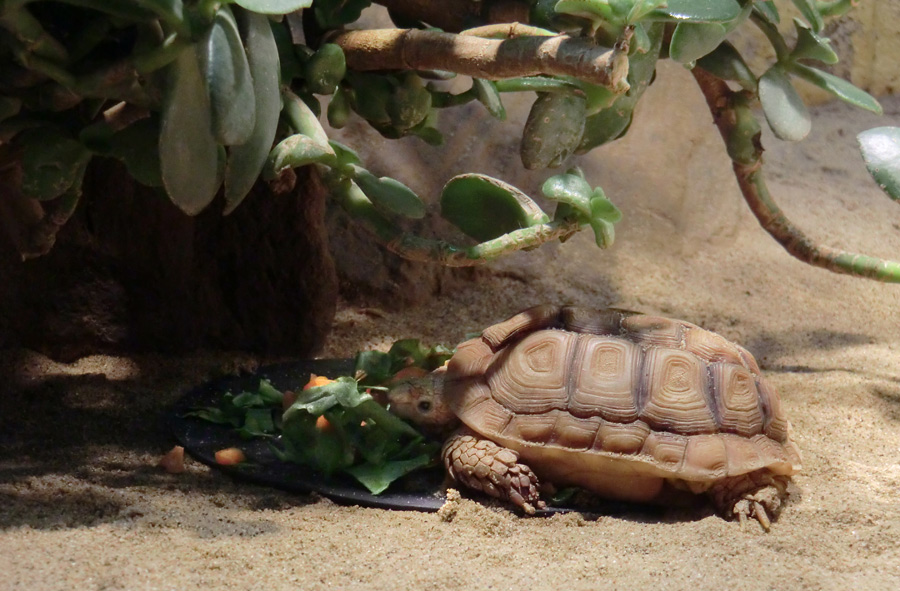 Areolen-Flachschildkröte neben Kurzohr-Elefantenspitzmaus im Zoologischen Garten Wuppertal im Februar 2012.