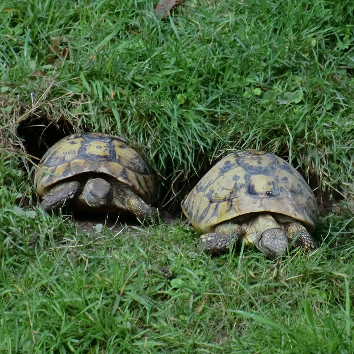 Griechische Landschildkröten (Testudo hermanni) im Wuppertaler Zoo im Juli 2012.
