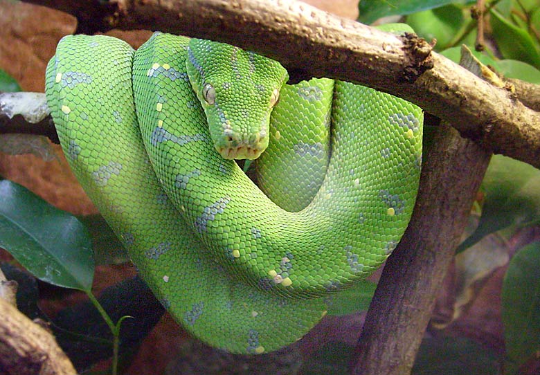 Grüner Baumpython im Zoo Wuppertal im April 2008.