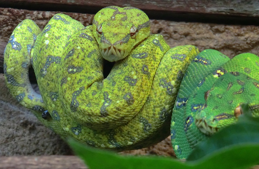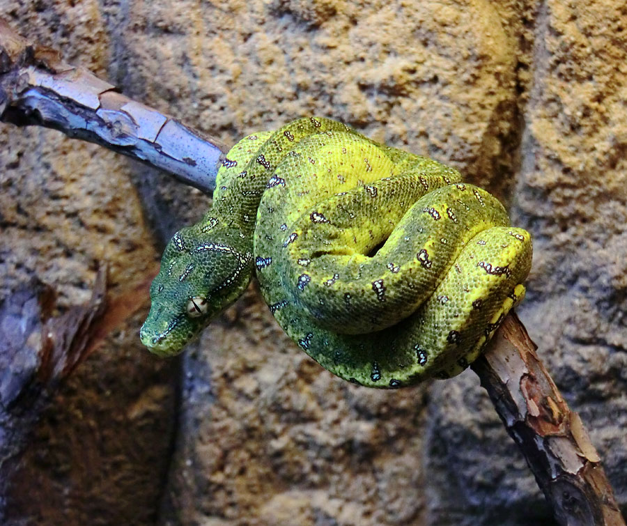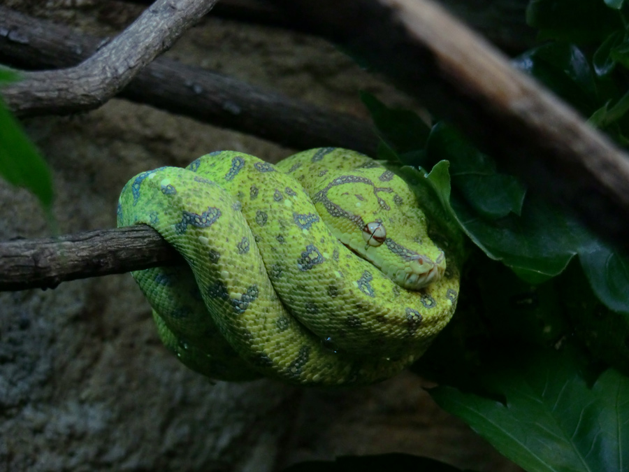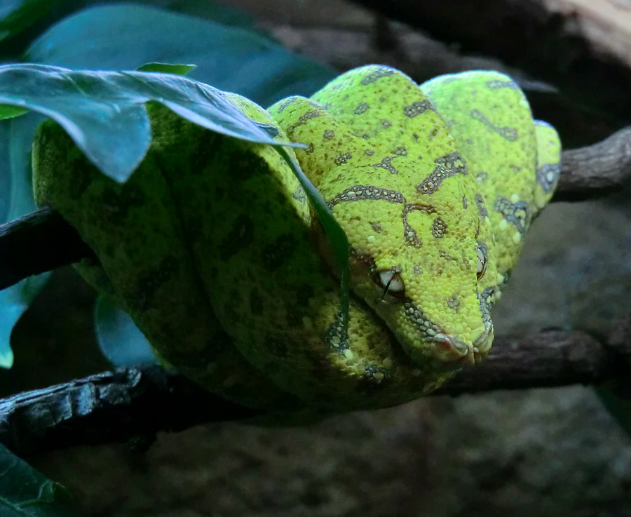 Grüner Baumpython Jungtier im Wuppertaler Zoo am 1. Dezember 2012.