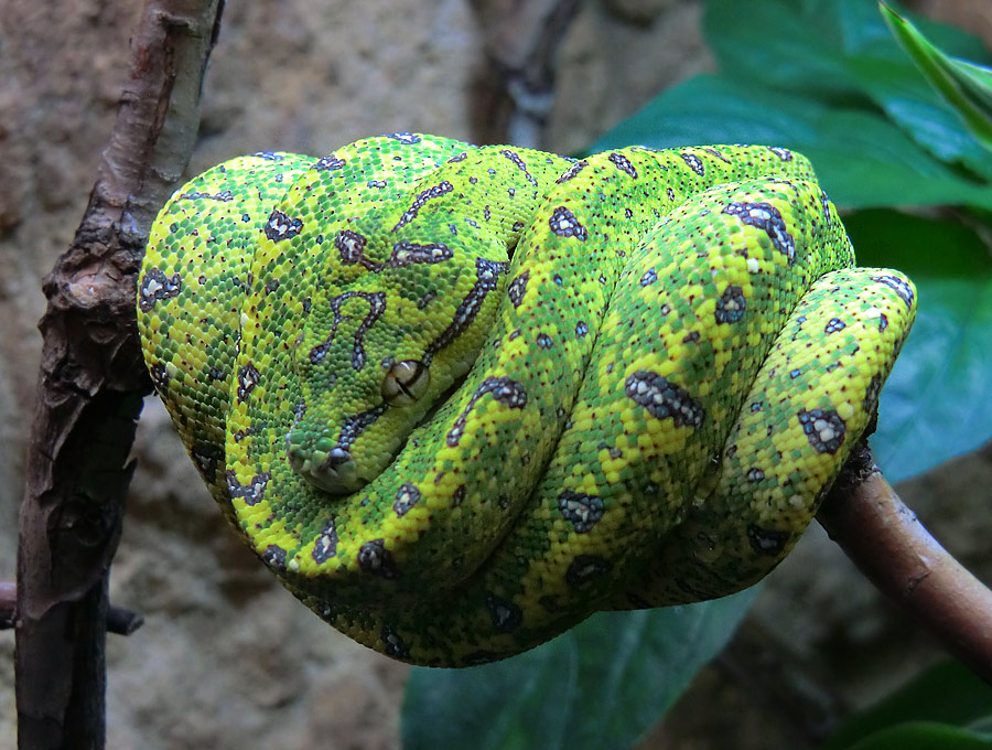 Grüner Baumpython Jungtier im Wuppertaler Zoo im Januar 2013.