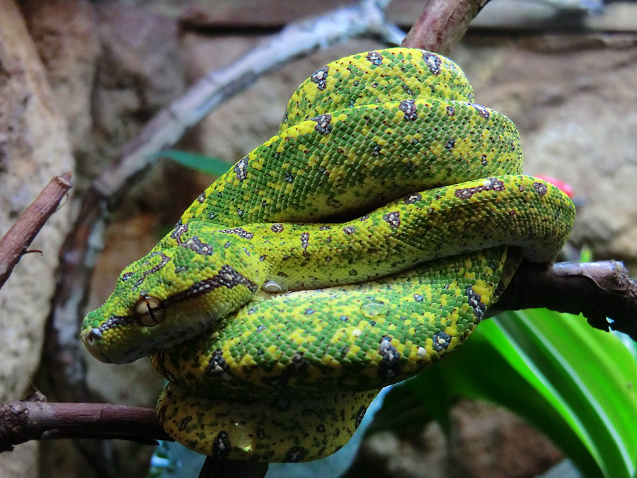 Grüner Baumpython Jungtier im Wuppertaler Zoo im Februar 2013.