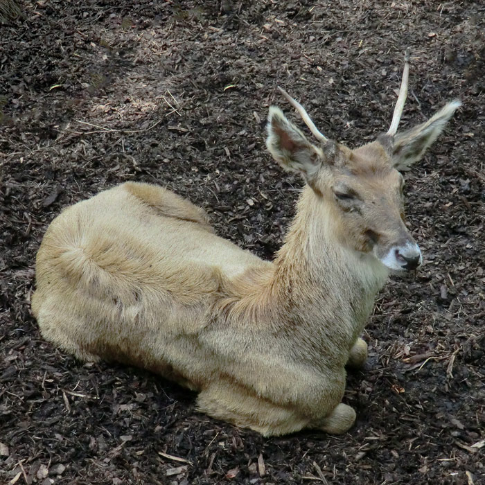 Weißlippenhirsch (Cervus albirostris) im Wuppertaler Zoo im Mai 2012.