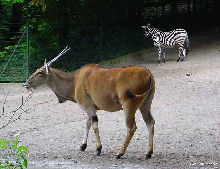 Elenantilope vor einem Böhm-Zebra im Zoologischen arten Wuppertal im Juni 2004.