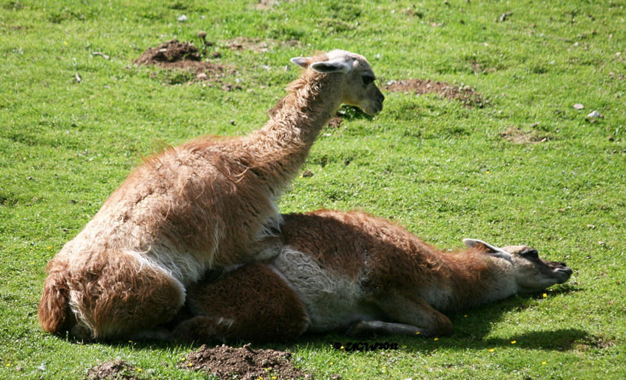 Guanako Mutter mit Jungtier im Zoo Wuppertal im Juni 2012.