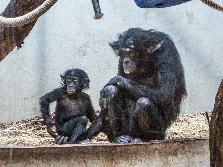 Bonobo-Männchen BILI und Bonobo-Jungtier AZIBO am 24. März 2019 im linken Sektor im Menschenaffen-Haus im Grünen Zoo Wuppertal.