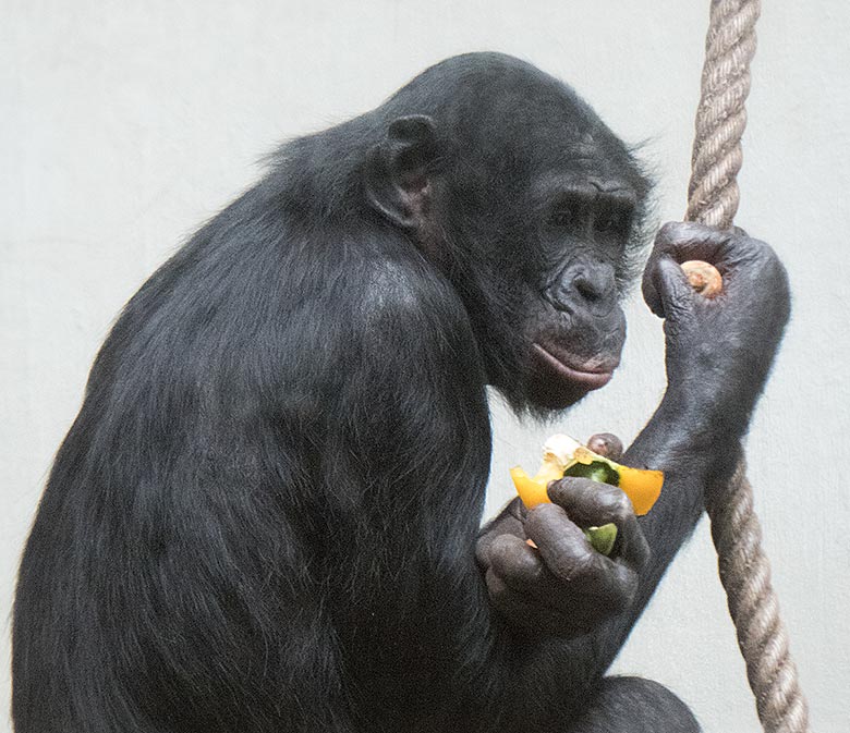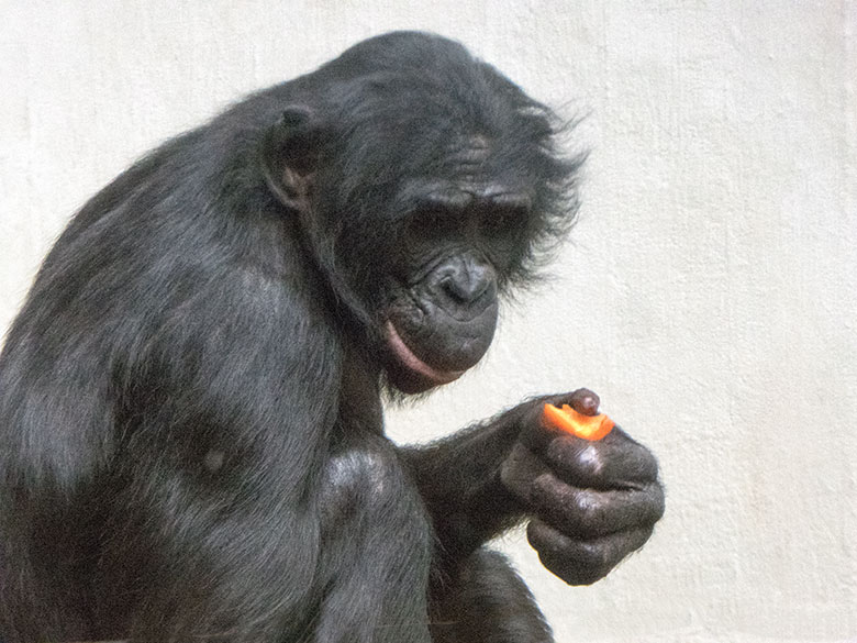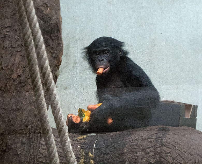 Bonobo-Jungtier AZIBO mit Möhren am 24. März 2019 im linken Sektor im Menschenaffen-Haus im Wuppertaler Zoo.