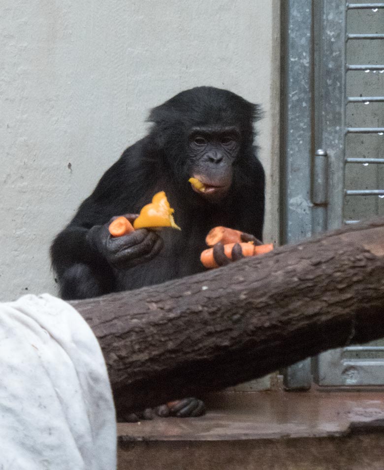 Am Sonntagvormittag gab es die übliche Fütterung mit Gemüse. Das Bonobo-Jungtier "Azibo" hat, wie viele andere Bonobos, eine Vorliebe für Möhren. Mit allen Händen und Füßen sammelte Bonobo-Jungtier "Azibo" Möhren-Stückchen ein. Die Zoobesucher/inen staunten, wieviele Möhren-Stückchen "Azibo" sammeln und tragen konnte.