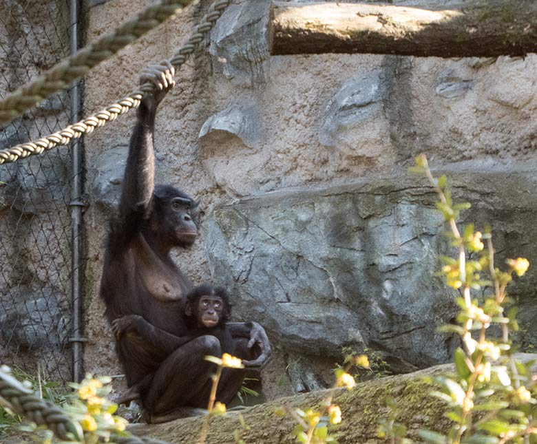 Bonobo-Weibchen EJA mit Bonobo-Jungtier BAKARI am 29. März 2019 auf der Außenanlage am Menschenaffen-Haus im Grünen Zoo Wuppertal.