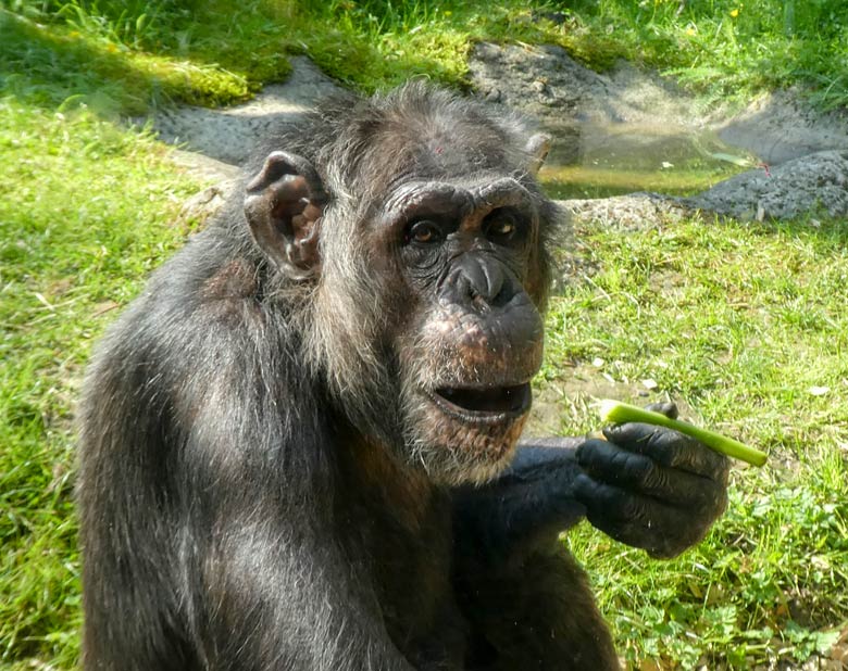 Schimpanse EPULU am 20. Mai 2018 auf der Außenanlage am Menschenaffenhaus im Grünen Zoo Wuppertal.