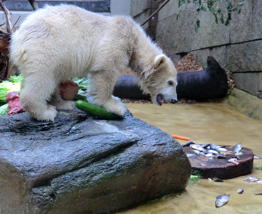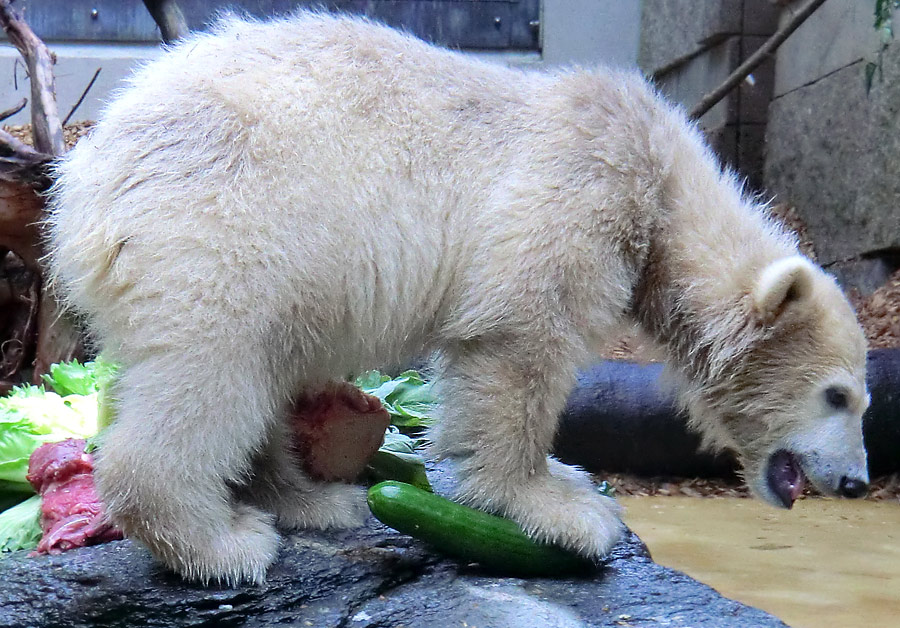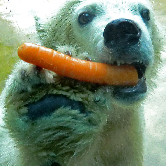 Eisbärmädchen ANORI am 1. Juni 2012 mit Karotte im Zoo Wuppertal.