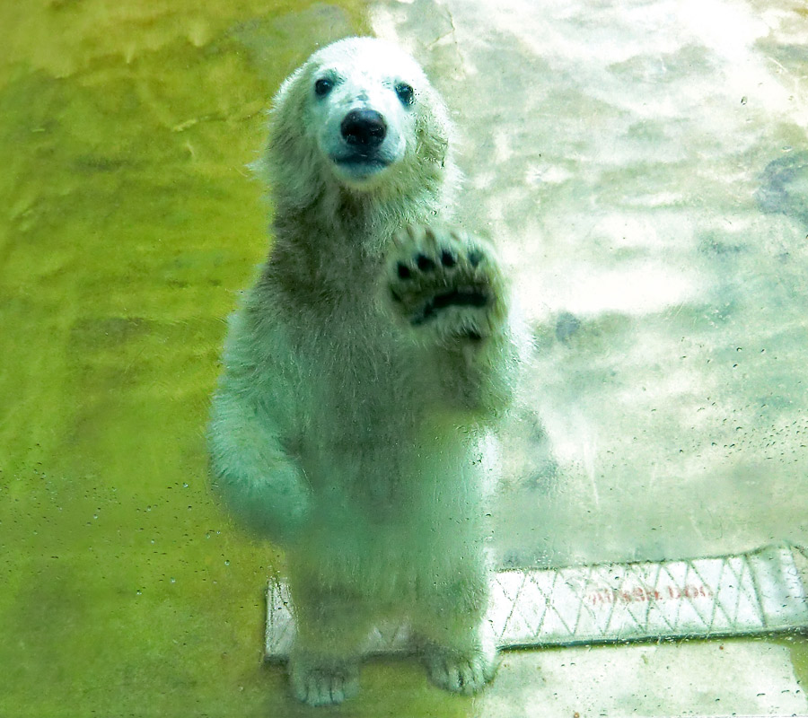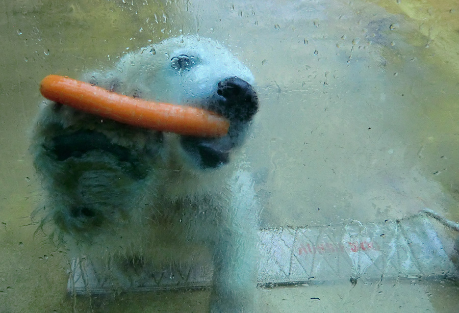 Ganz begeistert spielte Eisbärmädchen ANORI am Freitag Morgen mit einer Möhre und zeigte sie stolz direkt an der Glasscheibe den Besucher/innen im Wuppertaler Zoo.
