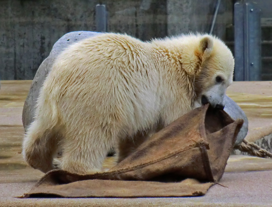 Am Samstag Morgen gefiel ANORI das kleine Säckchen so gut, dass das Eisbärmädchen das Säckchen von der kleinen Mutter-Kind-Anlage zur großen Freianlage trug und dort ausgiebig zum Spielen nutzte.