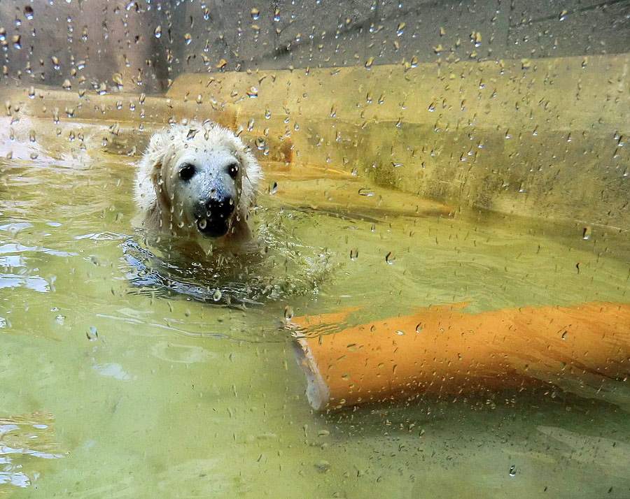 Bei schönem Wetter am Wochenende und an Feiertagen wollen viele Zoobesucher/innen das Eisbärbaby gleichzeitig sehen. Wartezeiten, die selten länger als zehn Minuten dauern, sind dann schon einzukalkulieren, aber man hat dann nicht immer den Wunschplatz am Fenster. Hat man einen Fensterplatz ergattert, dann braucht man noch das Glück, dass das Eisbärbaby und die Mutter auch fotogen abgelichtet werden können. Die Bewegungsfreiheit an der Scheibe ist für die Fotografen bei starkem Zuschauerbesuch deutlich eingeschränkt. Manchmal spielen die hinreissenden Mutter-Kind-Szenen leider genau vor den anderen Fenstern, die man dann ausgerechnet nicht erreichen kann.