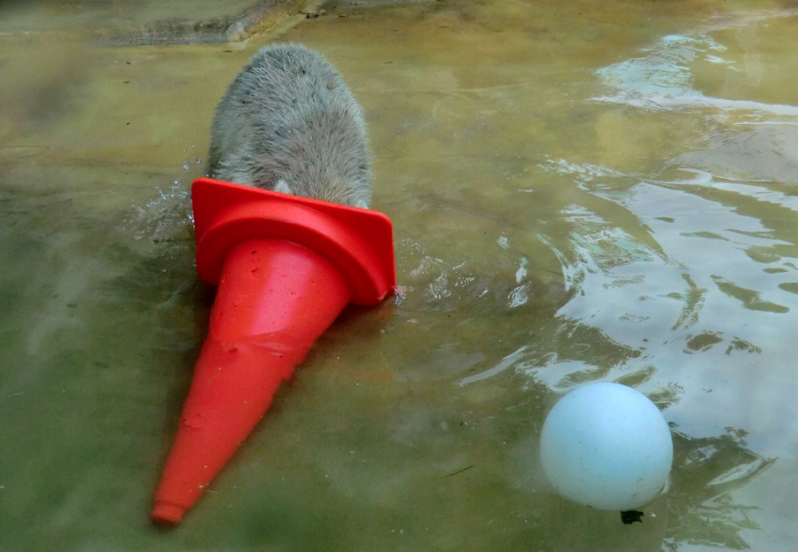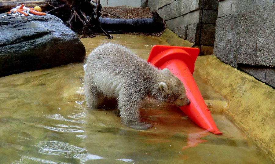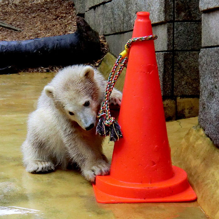 Am Montag, dem 21. Mai 2012, wollte Eisbärbaby ANORI die Spielkordel vom Hütchen holen. Beim aufrecht stehenden Hütchen wollte es anfangs nicht so richtig klappen. Als das knallrote Hütchen aber umgefallen war, konnte Eisbärchen ANORI die Spielkordel vom Hütchen abziehen.