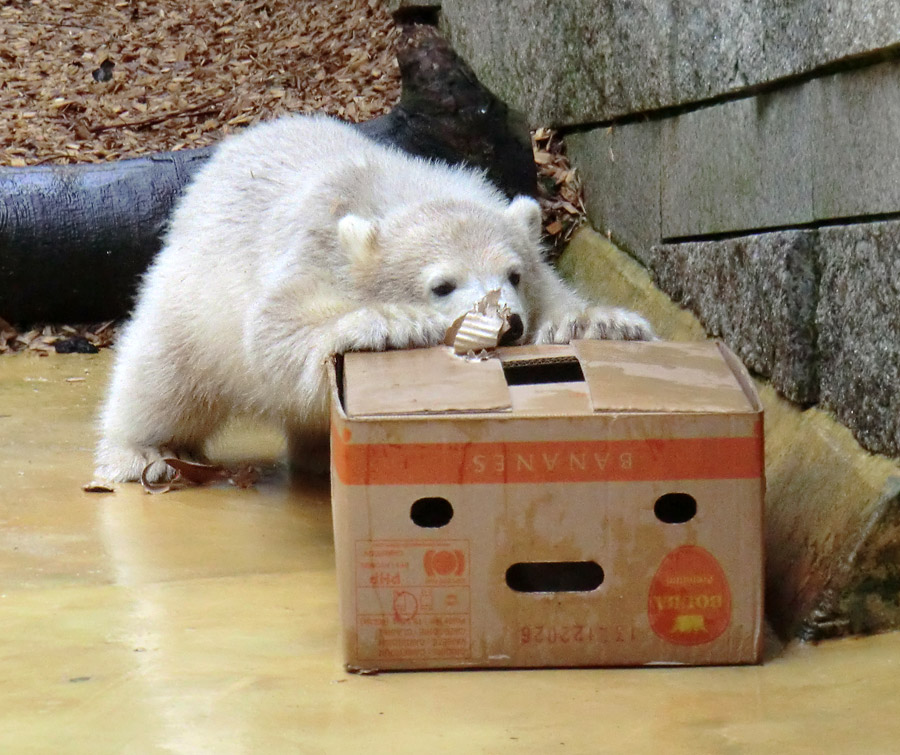 Abwechslung gab es auch im Animationsprogramm für die beiden Eisbären: die Tierpflegerin hatte zwei Bananen-Kartons auf die Anlage gelegt.