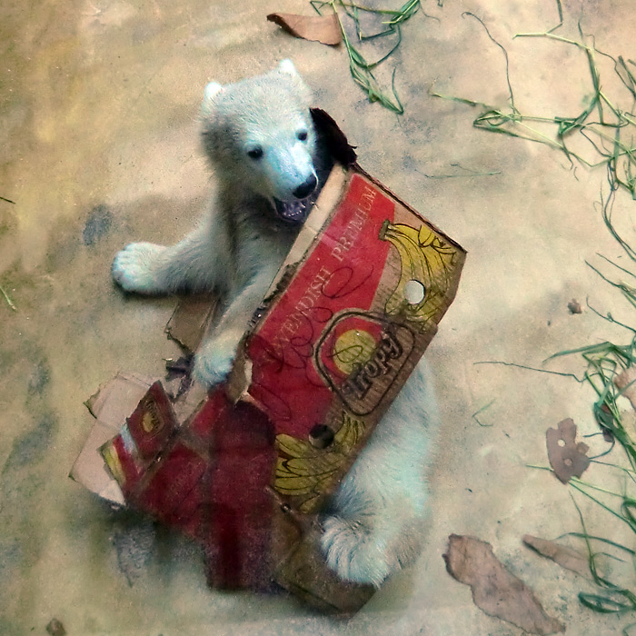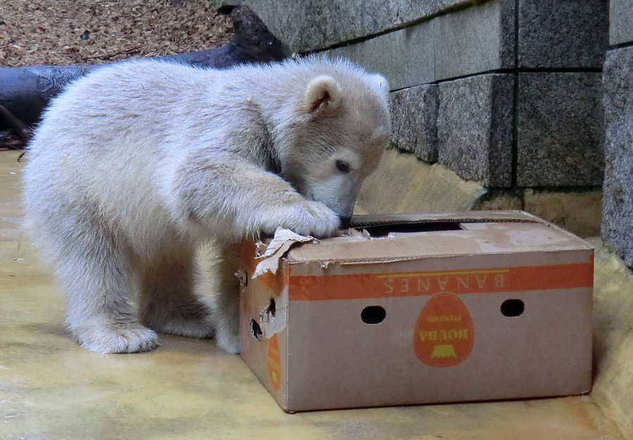 Während Eisbärin VILMA ihren Kopf in einen Karton steckte, um verborgenes Futter zu suchen, untersuchte Eisbärbaby ANORI die beiden Kartons gründlich. Nach ausgiebigem Beschnuppern wurden beide Kartons von ANORI nach einer halben Stunde kunstgerecht zerlegt.