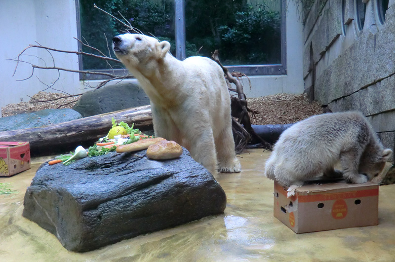 Am Sonntag Morgen war der "Frühstückstisch" für Eisbärin VILMA und Eisbärbaby ANORI reichlich gedeckt. Zur Abwechslung gab es außerdem frisch geschnittenes sattes Grün.