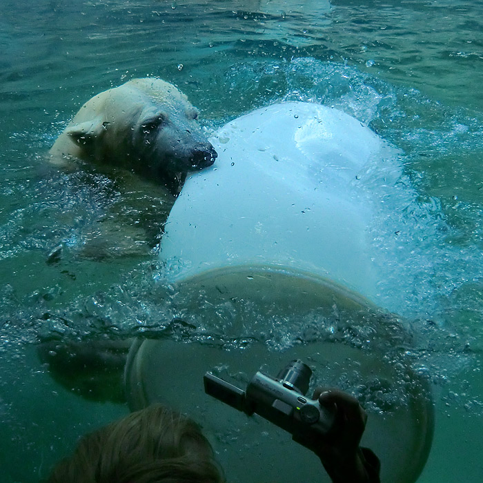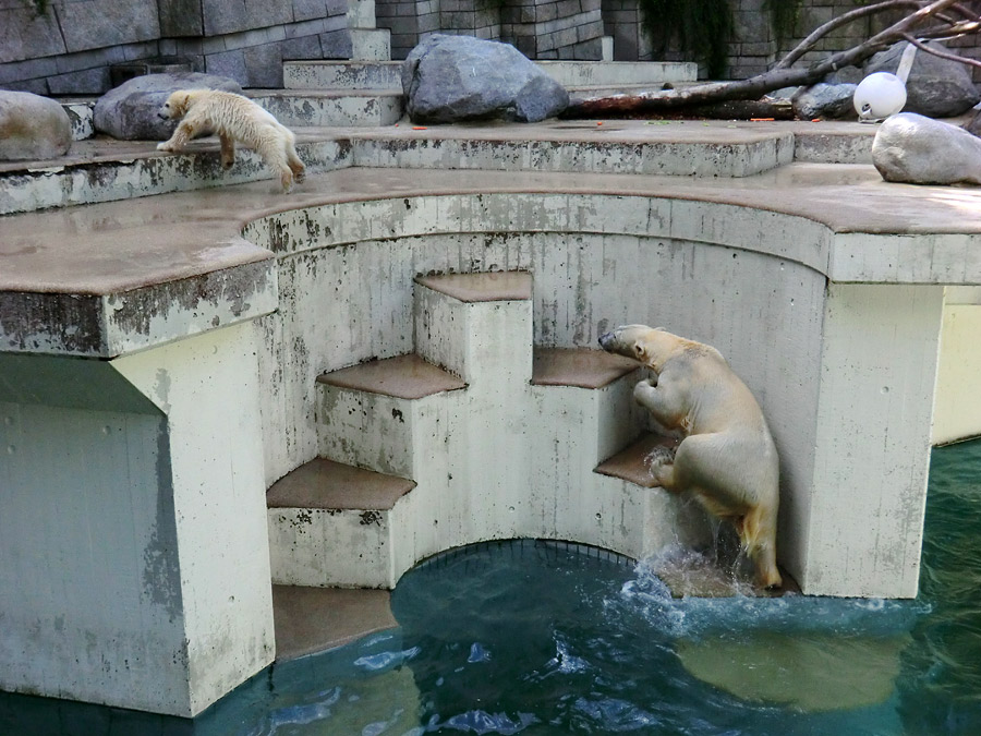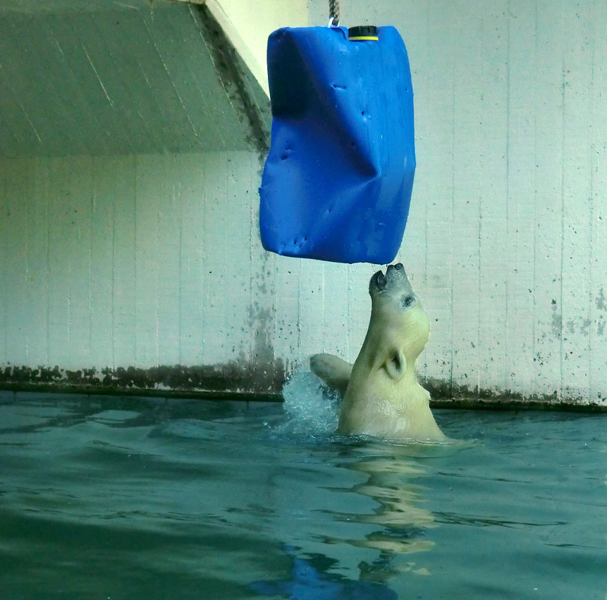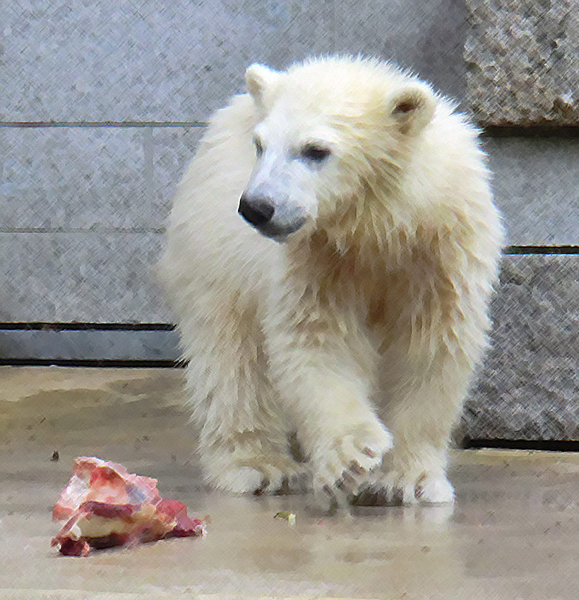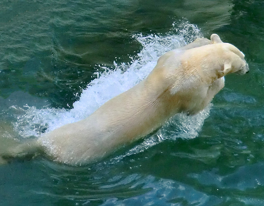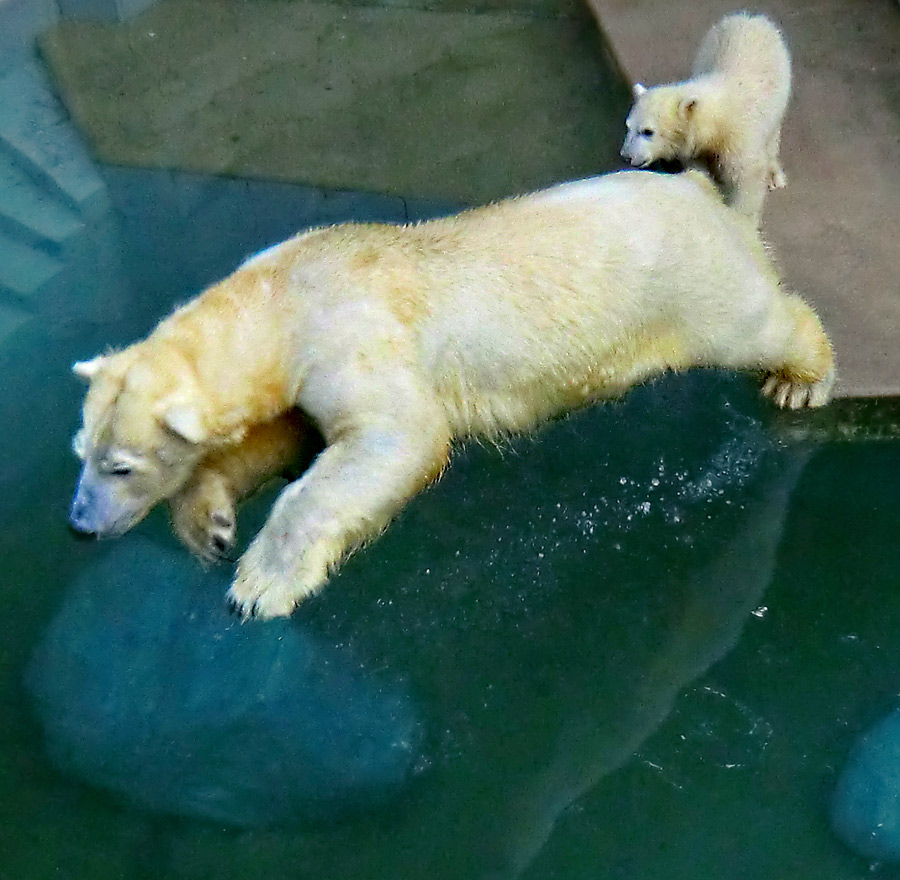 Eisbärmädchen ANORI braucht zwar morgens eine Weile, bis sie der Mutter ins Wasser folgt. Dann aber zeigt sie, dass sie die Eisbärtochter von VILMA ist. ANORI springt zwar noch nicht von der Plattform ins Wasser, aber gern am Mittelaufgang von den unteren Stufen.